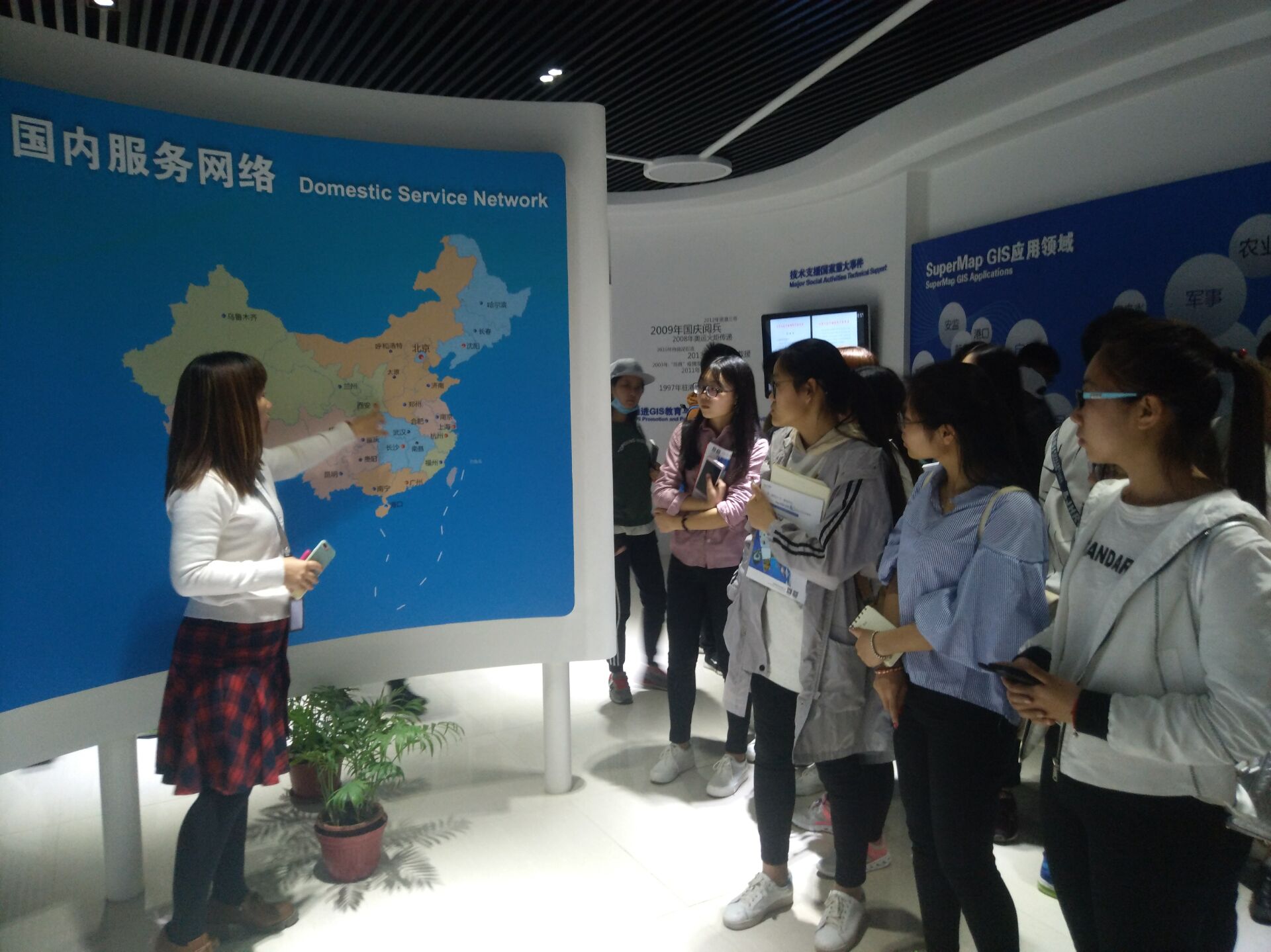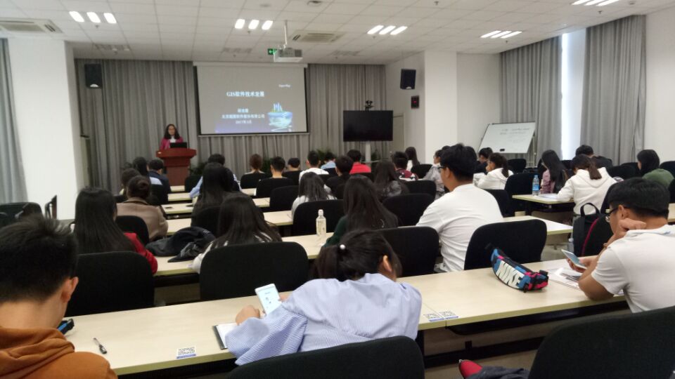 教育推广主管郭蕊热情接待了公司师生。在郭蕊的带领下,师生们参观了公司文化展厅,了解了公司历史和战略文化,体验了超图开发的酷炫三维建模技术,参观了舒适的公司办公环境。郗连霞作了的主题报告,介绍了超图的云GIS平台、在线云服务、二三维一体化以及桌面版iDesktop Cross等代表性技术,让师生们接触到GIS行业前沿。在问答环节,超图公司员工仔细回答了师生们关于产品优势、行业发展、就业等方面的问题,并表示愿意为同学们提供一定的实习和就业机会。