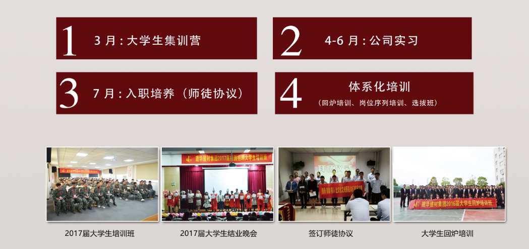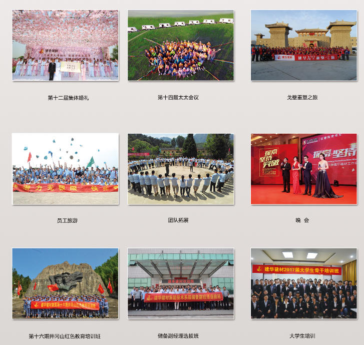 自2002年起,建华建材每年都在全国部分高校招收大量的优秀毕业生,开展老员工就业集训营活动,并由专职老师讲解有关就业指导、职业素养、社交礼仪、企业文化等课程,使其尽快完成由员工往社会人、企业人的转变。2018届老员工培训计划: