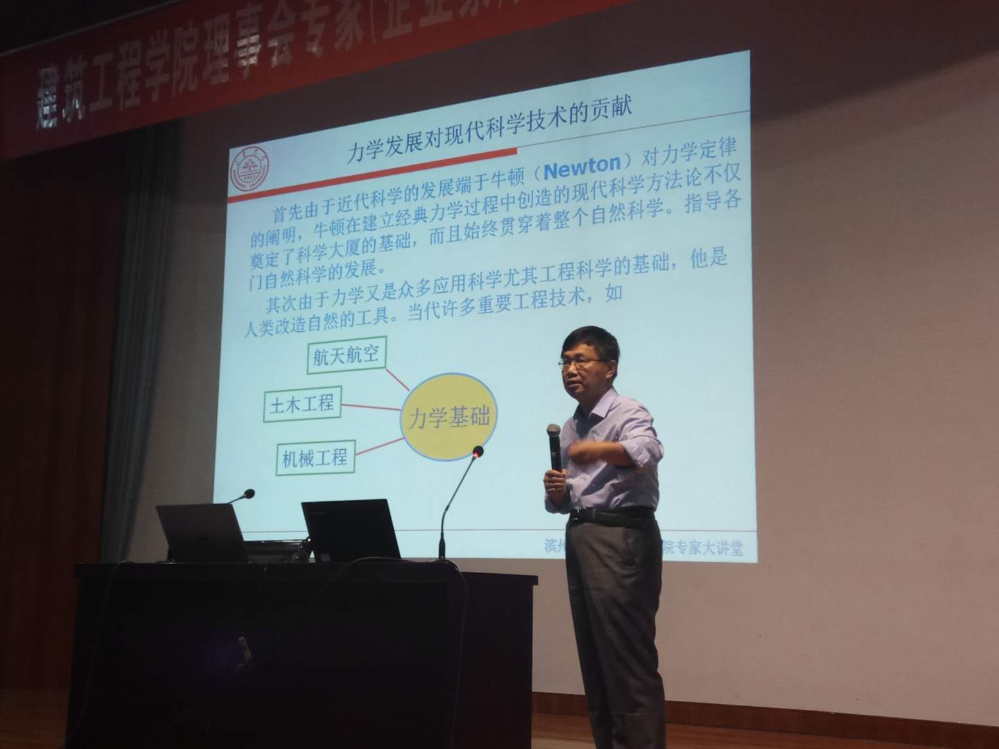 启动仪式后,大讲堂邀请山东大学博士生导师冯维明教授进行了《力学发展对现代科学的贡献》学术讲座。冯教授从力学发展的起源与历史切入,剖析了力学的内涵,阐述了力学对现代科学的与技术的支撑。同时,围绕力学和航空工程的关系,与大家分享力学在现代航空技术上的应用。讲座结束后,冯教授与部分参会师生进行了互动交流。