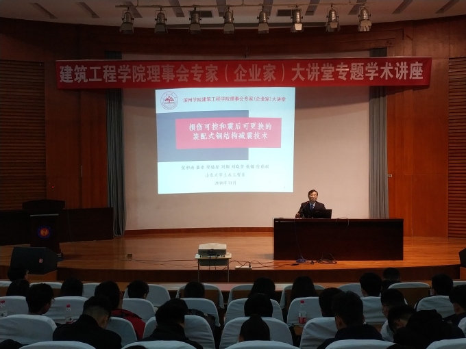 11月5日,公司理事会专家大讲堂在学苑会堂第二报告厅举行第四场学术讲座,邀请山东大学博士生导师侯和涛教授作“损伤可控和震后可更换的装配式钢结构减震技术”的学术讲座。