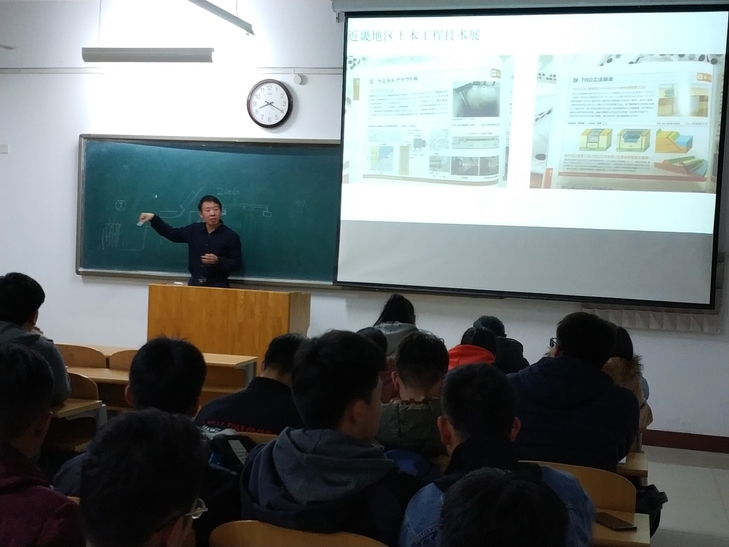 尚文涛结合自己在日本京都大学一年的生活学习经历以及科研收获,将报告内容分为4个方面:日本趣事、日本京都大学趣事、课程学习及听报告、科研进展,详细介绍了岛国日本的地理风光、人文精神、民居环境以及高等教育发展情况,对日本京都大学的发展历程、科研水平、团队力量、学术氛围以及土木与建筑工程公司的专业设置等进行了重点解读,使在座师生增进了对该校的认识和了解,为相关专业员工继续深造提供了借鉴和参考。随后,尚文涛博士分享了自己旁听4门研究生课程和聆听近百场学术报告的个人体会与心得,生动讲述了平面应变统一强度方程的提出历程,并展示了其在挡墙土压力、地基临界荷载和隧道弹塑性分析中的应用途径和潜力。最后尚文涛向同学们介绍了国外的建筑本科教育模式,又深入浅出的给同学们分析了部分在日本的大师建筑,使在场学子获益匪浅。
