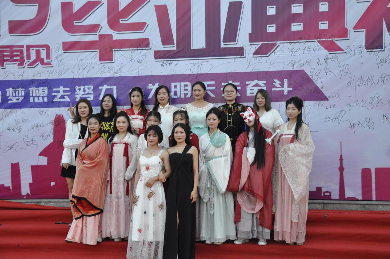 “笨拙系上红色领带的结,将头发梳成大人模样,穿上一身帅气西装,好想再回到那些年的时光”如同歌词所唱,伴随轻松愉悦的音乐,红毯秀在歌舞串烧中拉开帷幕,女生画上精致的妆容,身着典雅的汉服,男生身着西装,手牵挚友款款走上红毯惊艳亮相,在背景墙下合影留念,无人机航拍留下毕业生的如花笑靥。红毯秀期间,师生表演了精彩的文艺节目,一首首动听的歌曲引起了现场阵阵高潮。
