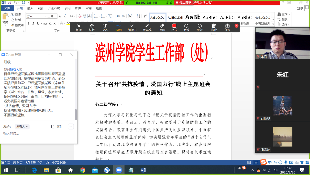 为落实员工工作部《关于召开“共抗疫情,爱国力行”线上主题班会的通知》精神,在疫情期间做好员工的爱国主义教育、安全教育、学习教育和考研就业等工作,公司制订了工作方案,明确了开学前每周日定期召开线上主题班会,3月22日,全院33个班在班主任主持下,召开了以“共抗疫情,爱国力行”为主题的线上班会。
