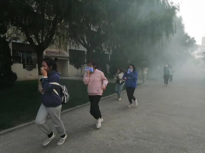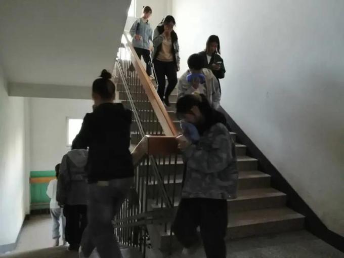 警报响起,在12号宿舍楼,带队人员组织同学迅速进入紧急疏散通道,全体员工用湿毛巾捂住口鼻有序撤出员工公寓,活动过程员工们规范、有序、紧凑、高效的按照疏散演练方案设定的逃生路线,迅速而有序地到达指定安全位置。在主活动现场,市消防队队员利用云梯车、消防车进行了灭火和解救被困人员演练。保卫处工作人员给员工们讲解了灭火器的使用方法。