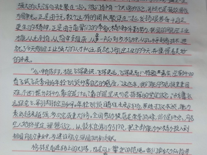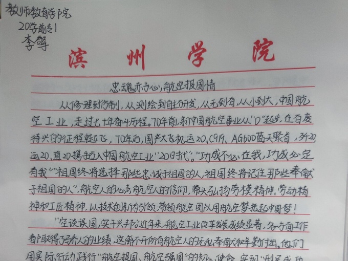 活动期间,同学们紧扣“航空情.报国志”主题,以个人与民族、国家、社会和新时代的关系为叙述角度,围绕我国航空事业发展史,结合航空业典型案例,向我们展现了他们对“航空报国、航空强国”这一句话的独特见解。参赛作品中不仅包含古人追寻飞天梦想不断探索的精神,还简括了冯如为开拓和发展我国航空事业奋斗一生、至死不渝的感人故事。同学们以文字的形式,充分展现了一代代航空人发扬“忠诚奉献,逐梦蓝天”的航空报国精神,以及其淡泊名利、甘于奉献、坚守担当、攻坚克难的崇高品质。活动结束后,同学们纷纷表示会树立远大志向,在航空报国精神的指引下,以高度的使命感和责任感,为公司建设以航空为主要特色的高水平应用型大学而贡献青春力量。