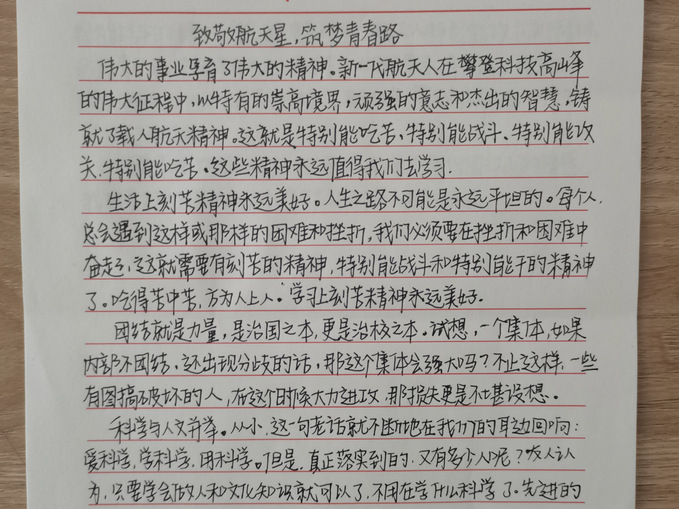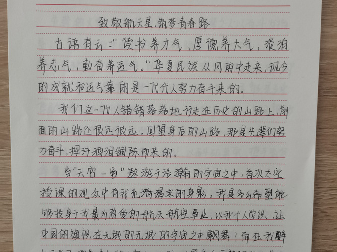 此次活动,同学们紧紧围绕“致敬航天星,筑梦青春路”的主题,以写作的形式,追忆我国的航天发展史,抒发自己对航天英雄、航天科技工作者的敬佩之情。选手们满怀激情,提笔写下一篇篇满含航天情怀的文章,以文字的形式传递出内心的声音,字里行间透露出对老一辈航天人矢志不渝的报国心、孜孜以求的强国梦、用青春和热血铸就的航天精神的崇拜,对航天科技工作者的尊敬、对青春的感悟,表达出公司员工展现出同学们立志传承航天精神、坚持以青春之我,拼搏奋斗的决心。
