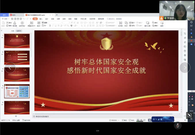 各年级辅导员通过演示文件讲解、观看纪录片等形式进行讲解,强调国家安全是关系到国家存亡的大事,没有国家安全,就没有和平稳定的建设环境,就没有社会主义的现代化。每个公民都肩负有维护国家安全的责任和义务。因而,老员工学习系统的国家安全知识、树立正确的国家安全意识,是其作为现代化建设生力军之必需。让我们时刻保持谦虚谨慎的作风,守护好国家安全屏障,为祖国的富强奋斗终身。