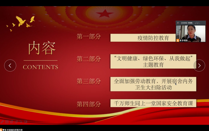 会议由各年级辅导员主持。会上重点强调了四点内容:第一是疫情防控教育,强调了公司疫情防控期间的管理规定,要求员工非必要不离校、不离滨,提高防疫自觉性,积极配合公司的防疫工作,佩戴好口罩,禁止校外外卖进入校园,杜绝疫源隐患。第二是“文明健康、绿色环保、从我做起”主题教育,强调老员工应文明用语,爱护环境。第三是全面加强劳动教育,开展宿舍内务卫生大扫除活动,强调做好宿舍卫生,整理好内务,积极参与劳动活动。第四是国家安全教育,强调作为一名老员工,要践行总体国家安全观,提高警惕和鉴别力,进一步调动起共同的责任意识和危机意识。