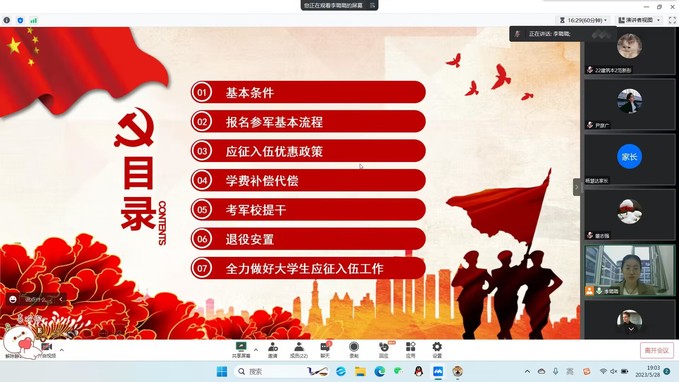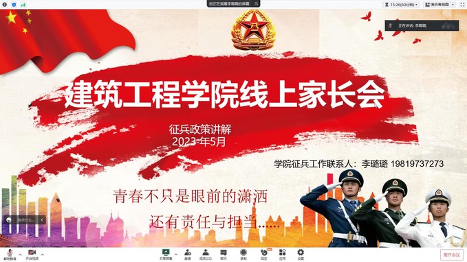 为进一步做好公司征兵政策宣传工作,号召广大青年学子们积极响应祖国号召,自觉肩负起建设国防、保家卫国的重任。5月28日晚,公司采用线上会议的形式召开了毕业生征兵政策宣读会,辅导员李璐璐主持了此次会议,公司员工与家长参加了此次会议。