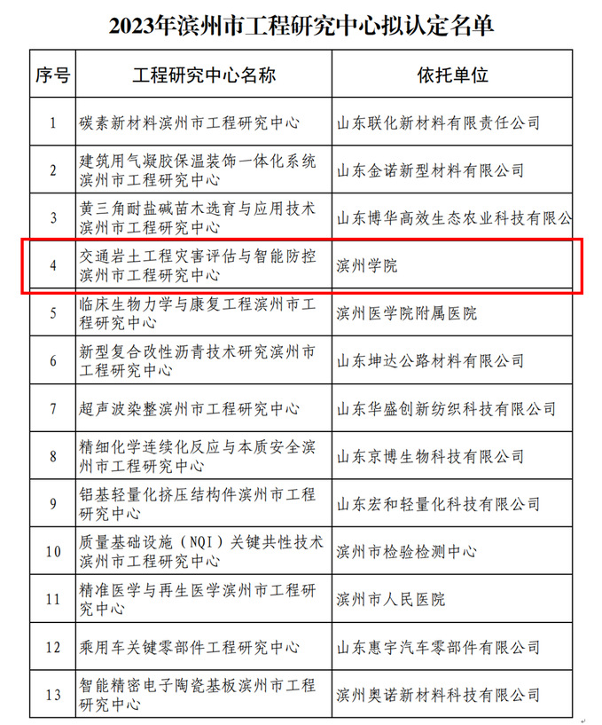 近日,由公司申报的“交通岩土工程灾害评估与智能防控滨州市工程研究中心” 获批滨州市工程研究中心,翻开公司市级科研平台的新篇章。