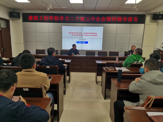 为深入学习贯彻党的二十届三中全会精神,11月5日下午,建筑工程公司在9教215会议室举办学习党的二十届三中全会精神辅导报告会。此次报告会邀请到了马克思主义公司副经理王勇军博士作为主讲人,公司领导、全体党员教师和教职工党外人士代表参加了此次学习活动,党总支书记许广生主持报告会。