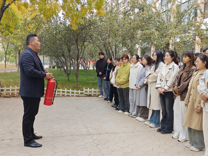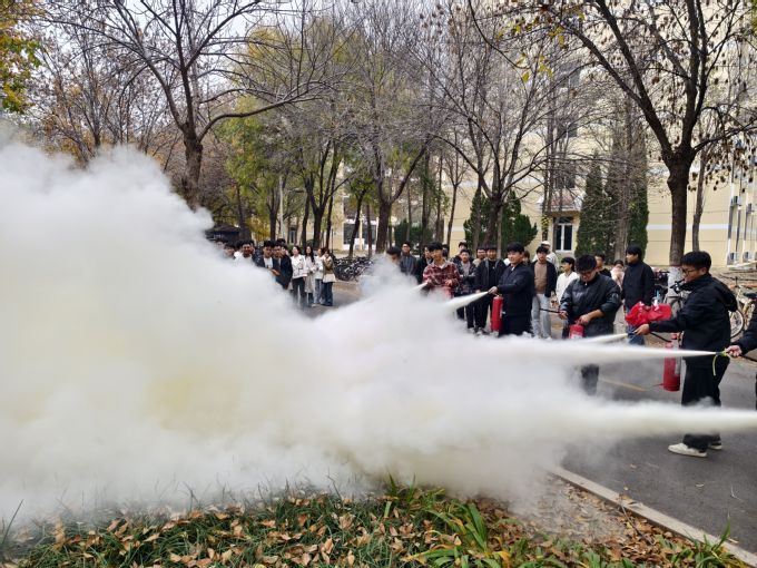 演练开始前,保卫处相关同志首先向同学们科普了火灾发生的主要原因、火灾发生后造成的危害、火灾预防措施以及火灾发生时的自救互救等常识,提高了同学们对火灾消防的认识。随后,负责同志展示了日常生活中常见的消防设施和器材,如灭火器、消防栓等,并详细介绍了它们的使用方法和注意事项。在讲解完理论知识后,工作人员现场演示了灭火器的正确使用方法,包括“提、拉、握、喷”的基本操作步骤。随后,同学们分组进行了灭火器的实际操作体验,确保每位参与者都能熟练掌握基本的消防技能。