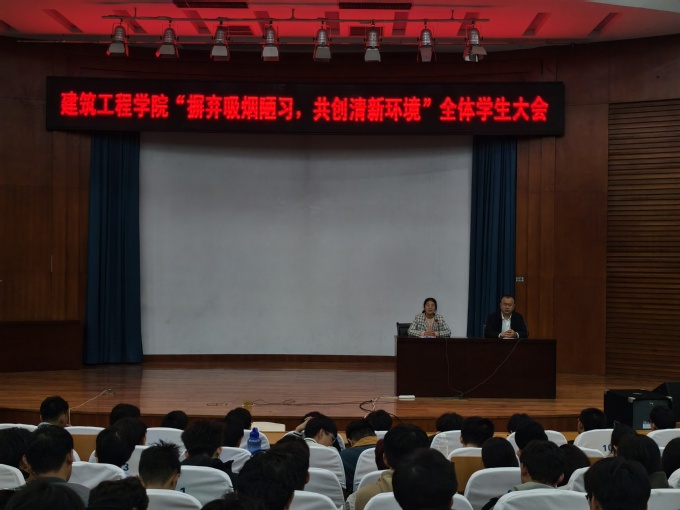 为了深入推进无烟校园建设,提高员工对吸烟严重危害个人健康的认识,从根本上杜绝个别员工在公共场合特别是宿舍内吸烟的违法违规行为,11月12日晚,建筑工程公司在明德报告厅举行了以“摒弃吸烟陋习,共创清新校园”为主题的校园控烟行动月启动仪式。