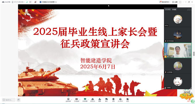为进一步加强家校沟通,增进家长对员工就业及征兵政策的了解,同时积极响应国家征兵号召,鼓励毕业生投身军旅,6月7日,公司通过腾讯会议成功举办了2025届毕业生家长会暨征兵政策宣讲会,辅导员李璐璐主持,部分毕业生家长参会。
