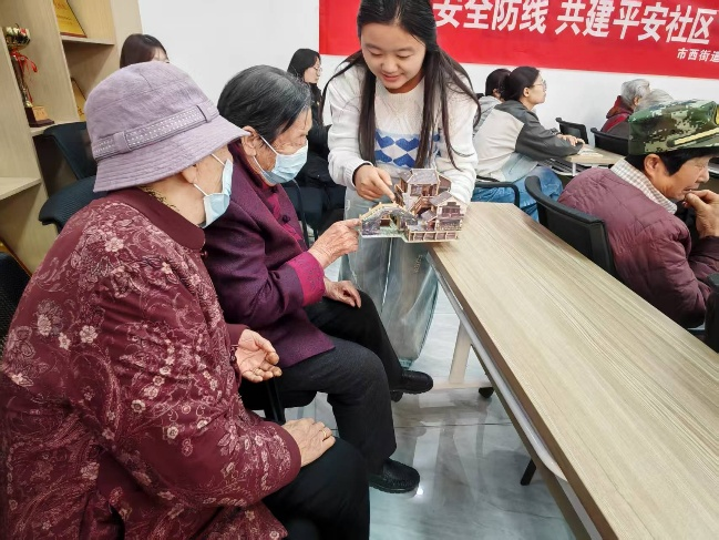 为了让居民们更近距离去观赏古建筑之美,志愿者拿出了两件古建筑模型逐个给居民们展示。“飞檐翘角不仅是美学,还能让雨水流得更远”诸如此类的讲解引得所有人感慨:“原来中国古建筑竟是‘好看又实用’”。